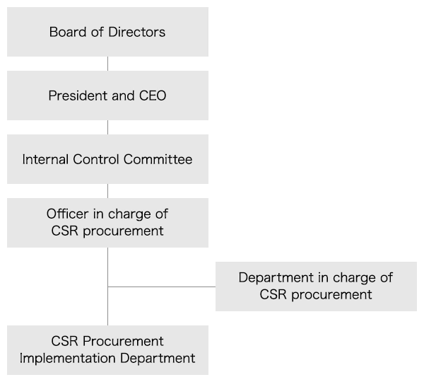 TAIYO YUDEN Group's CSR activities are overseen by the Internal Control Committee, and compliance promotion activities are operated by a system in which officers and departments in charge are appointed for each article of the CSR Code of Conduct as promotion organizations, and each Group company implements activities according to the activity policies and group-wide rules provided by them. CSR procurement activities are embodied by the officer in charge of CSR procurement and the department in charge of CSR procurement, and are carried out by the CSR procurement implementation department of each Group company.