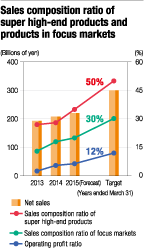 We will continue the expansion of the sales composition ratios of our high value-added super high-end products to 50% and of our focus markets, including automobile electronics, industrial equipment, medical and healthcare, and environmental and energy, to 30%. By changing our main evaluation benchmark from operating income to net profit, implemented during the year ended in March 2014, we created a framework with established mini-companies in each of our business domains that are empowered to act independently and pursue positive results. This allows each group and the TAIYO YUDEN group as a whole to optimize sales and marketing decision making that drives an efficient utilization of our resources and facilities. Now that we have established our new structure we will focus on gaining a positive net cash flow and construct a solid financial base.