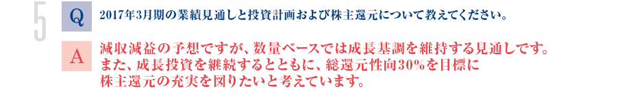 株主還元につきましては、収益体質および財務体質の改善を優先し、2015年3月期まで1株当たり年間配当金を10円に据え置いてきました。しかし、2016年3月期は、必要な成長投資を行いながらネットキャッシュプラスに向けた財務基盤強化を図ったうえで、1株当たり年間配当金を15円に増額しました。当社は総還元性向30%を目標としており、2017年3月期は、年間配当金20円(中間および期末配当金各10円)を計画しています。