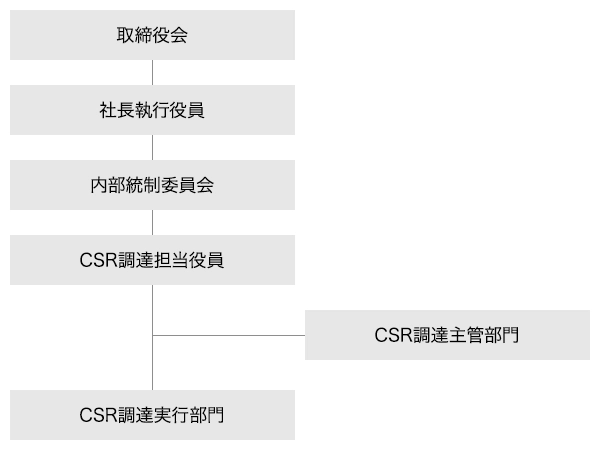 当社グループのCSR活動は、内部統制委員会が全体を統括し、推進組織としてCSR行動規範の各条文ごとに担当役員と主管部門が選任され、そこから示される活動方針やグループ共通ルールに従い、各グループ会社が実行する体制によって運営されています。CSR調達に関する活動はCSR調達担当役員およびCSR調達主管部門によって具体化され、グループ各社のCSR調達実行部門によって実行されています。